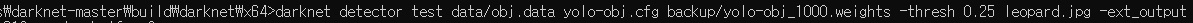 darknet detector test data/obj.data yolo-obj.cfg backup/yolo-obj_1000.weights -thresh 0.25 leopard.jpg -ext_output