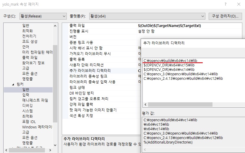 - 링커 - 일반 - 추가 라이브러리 디렉터리 - opencv의 build\x64\vc14\lib 경로 설정