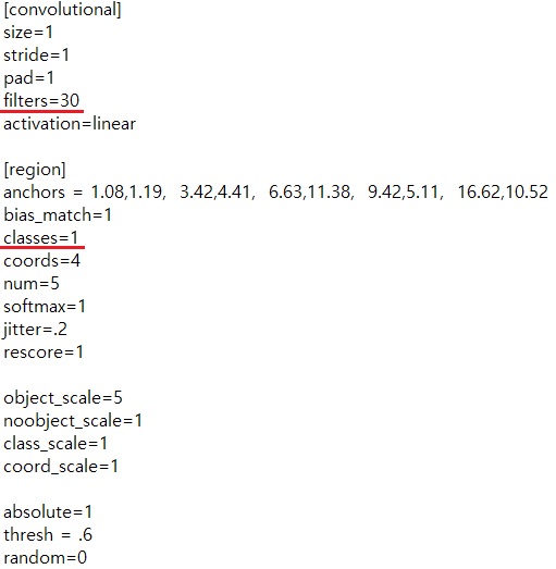 단일 오브젝트 검출이기 때문에 classes를 1로 수정합니다. 검출할 대상이 늘어나면 그만큼 값을 올려주시면 됩니다.